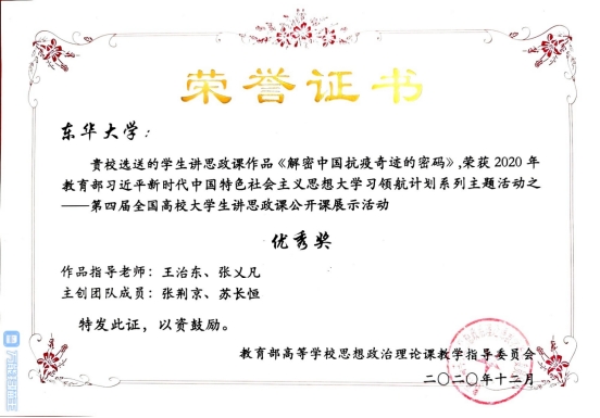 近日,我院收到由教育部高校思政课教学指导委员会主办、南开大学马克思主义学院承办的“领航计划”系列活动之“绽放抗疫青春·决胜全面小康”——第四届全国高校大学生讲思政课公开课展示活动证书。学生团队张荆京、苏长恒在比赛中荣获优秀奖,指导教师为我院院长王治东教授及青年教师张乂凡博士,这也是我校首次在“大学生讲思政课”活动中斩获佳绩。