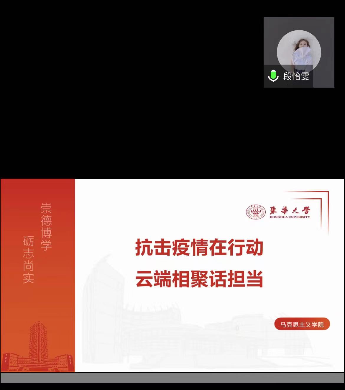 马理21硕的段怡雯同学作为党员代表在发言中表示,面对疫情,党员同志们更要以实际行动,发挥模范带头作用,彰显青年党员的使命担当;曹月晨同学因疫情被隔离在家,与同学们分享了居家线上学习的方法、调整心理状态的技巧;马理20硕罗海旗同学作为班干部代表发言,号召同学们疫情期间坚持“三件套”、“五还要”的防疫要求,不焦虑、不恐慌、不信谣、不传谣,积极配合落实学校各项防疫要求;纪沛彤同学作为学院研究生进东华附校讲党史思政课的具体负责人,正协助学院积极组织同学们推进“伟大精神”系列课程视频录制等工作,结合集体备课的实践,分享了疫情期间如何做好学习宣讲不断线的体会。