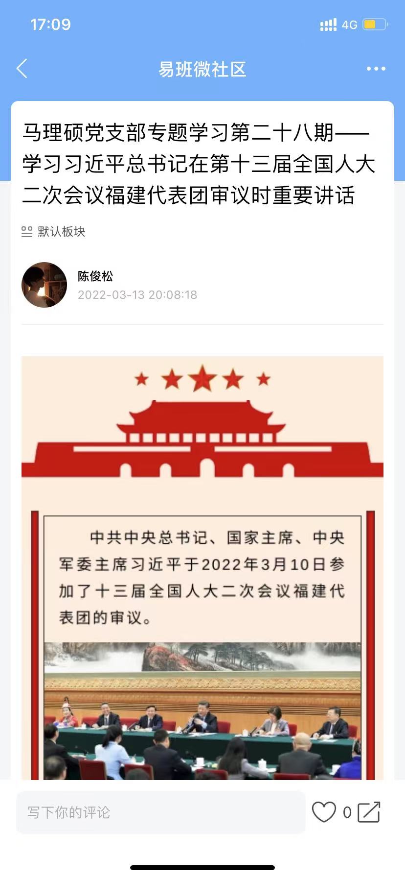 学院马理硕党支部积极响应学校党委号召,严格落实学校各项疫情防控要求,切实发挥战斗堡垒作用,争当模范先锋,让党旗在抗疫一线高高飘扬,为坚决打赢疫情防控突击战积极贡献力量。支部书记曾璇表示,在认真落实好防疫要求的同时,坚持学习不断线,支部将坚持“每日打卡”学习制度,利用易班平台定期组织推送专题理论学习,不断加强思想理论武装,引导广大党员和同学们切实提高政治站位,统一思想认识。