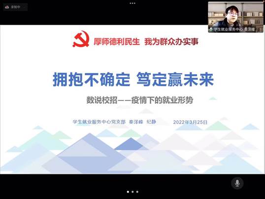 3月25日下午,马克思主义学院举办了“拥抱不确定,笃定赢未来”2022届毕业生就业主题活动,邀请校学生就业服务中心副主任秦泽峰老师、生涯教育部主管纪静老师分别带来了主题为“数说校招——疫情下的就业形势” 、“疫情当下如何克服焦虑顺利毕业就业”的讲座。学院党委书记戴叶萍出席,学院2022届毕业生及部分低年级同学共同参加,活动由辅导员于小越主持。