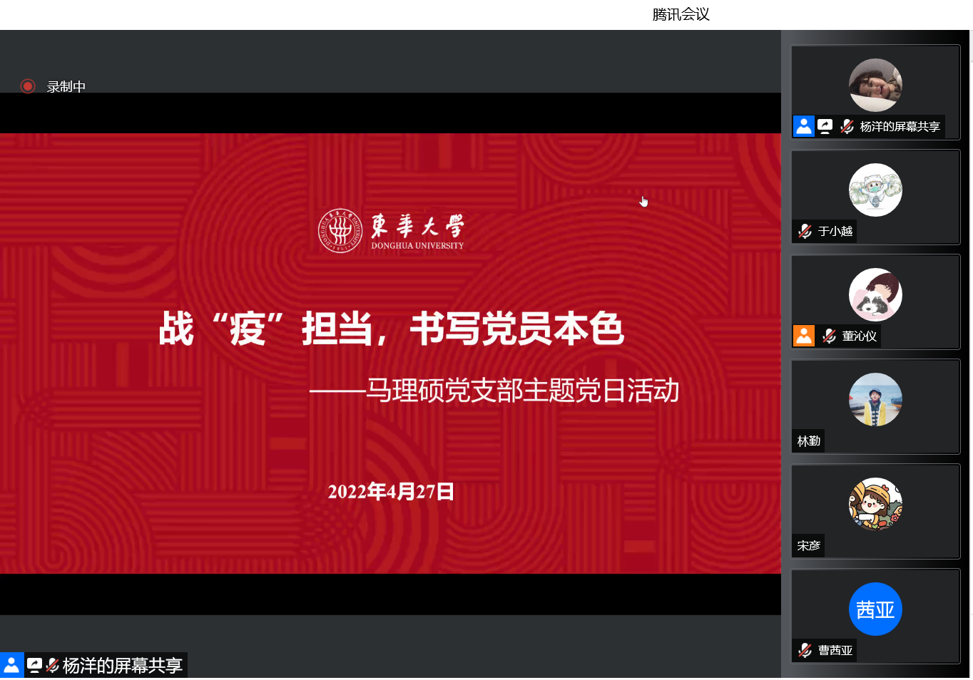 2022年4月27日下午,马克思主义学院马理硕党支部开展了战疫担当,书写党员本色,争做堪当民族复兴重任的时代新人——学习习近平总书记在中国人民大学考察时的重要讲话精神主题党日活动。学院党委书记戴叶萍老师、辅导员于小越老师和马理硕党支部全体党员、积极分子参加。本次活动由马理硕党支部书记杨洋主持。