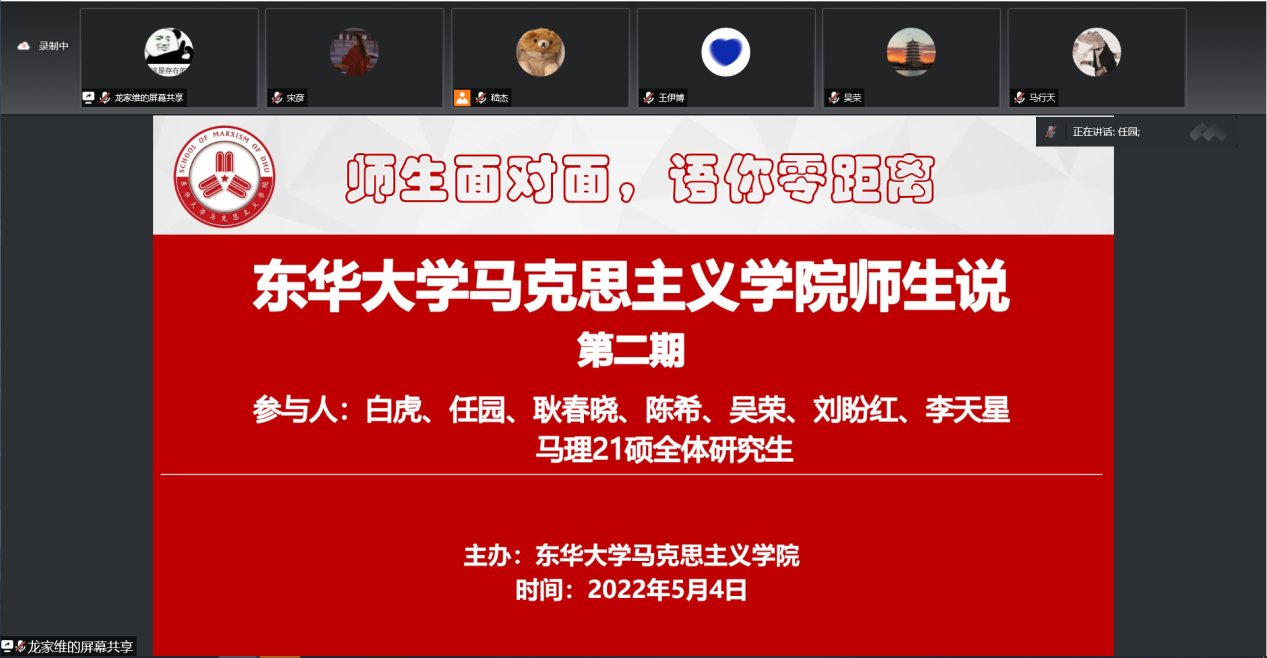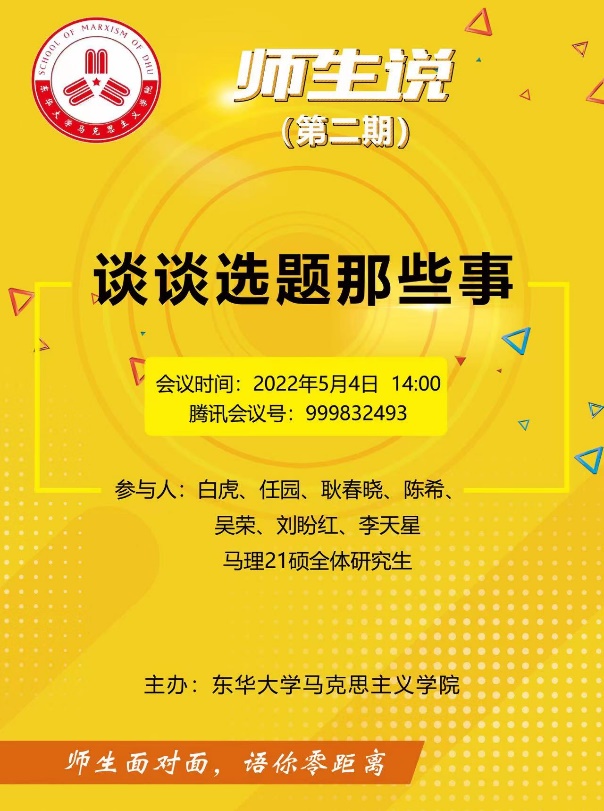 5月4日,正值五四青年节,马克思主义学院举行了“师生说”系列主题活动第二期——“聊聊选题那些事”。本期主题活动由白虎、任园、耿春晓、陈希、吴荣、刘盼红、李天星七名青年教师与马理21硕全体研究生在云端面对面、零距离共话成长。