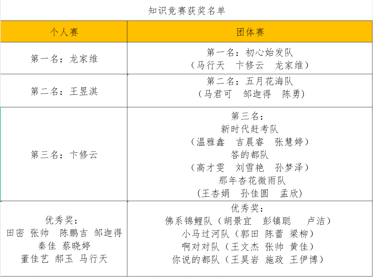 任园老师在点评中指出,党史知识是党百年光辉历程的体现,也是党百年奋斗历史意义的体现,希望大家以赛促学,学好党史知识。白虎老师指出当前正处于伟大的历史机遇期,马院的同学们更要认真学习,把党在历史转折点上不畏艰难的力量运用在实际生活中。胡博成老师祝贺了同学们在知识竞赛中取得了优异成绩,也肯定了同学们展示出的新时代马院学子的风采和良好的精神风貌。