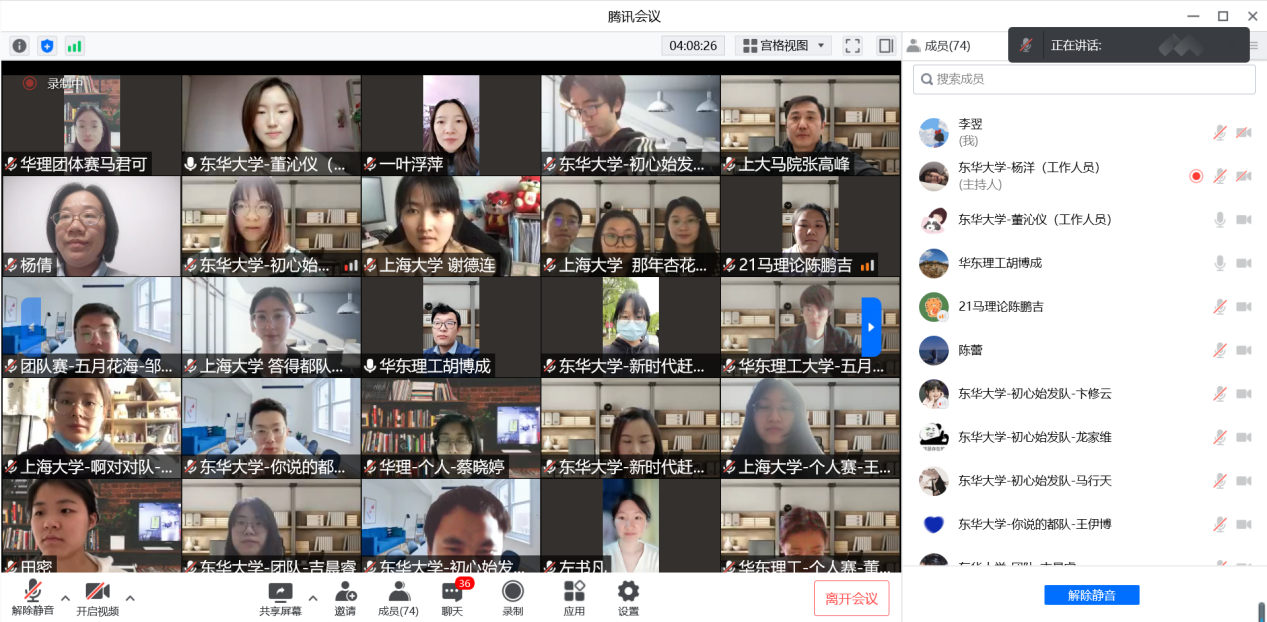 本次云知识竞赛分个人赛、团体赛两个环节,参赛选手和团队均做了充分准备,答题过程清晰流畅。经过激烈角逐,来自东华大学的龙家维获得个人赛第一名,上海大学王昱淇获得第二名,东华大学卞修云获得第三名。来自东华大学的初心始发队获得团体赛第一名,华东理工大学五月花海队获得第二名,东华大学新时代赶考队和上海大学答的都队、那年杏花微雨队并列第三。