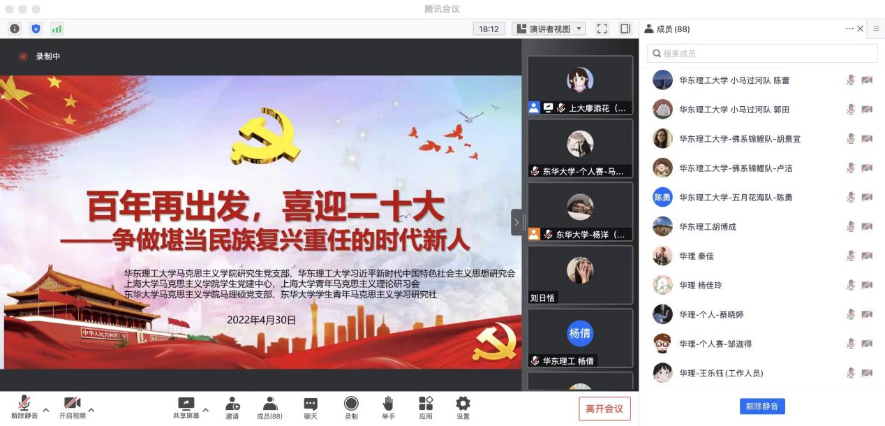 为深入学习贯彻习近平总书记在中国人民大学考察时的重要讲话精神,以实际行动迎接党的二十大胜利召开,4月30日,东华大学、华东理工大学和上海大学三校马克思主义学院在线共同举办了“百年再出发,喜迎二十大——争做堪当民族复兴重任的时代新人”云知识竞赛活动。来自三校马克思主义学院的12名个人赛选手和9支团体赛队伍参加了线上知识角逐。东华大学马克思主义学院党委书记戴叶萍,青年教师白虎、任园,辅导员于小越;华东理工大学马克思主义学院党委副书记杨倩,习研会负责人、团委书记胡博成;上海大学马克思主义学院党委副书记、副院长张高峰,学生党建中心主任、研究生辅导员谢德连参加活动。活动由东华大学马理硕党支部副书记董沁怡主持。