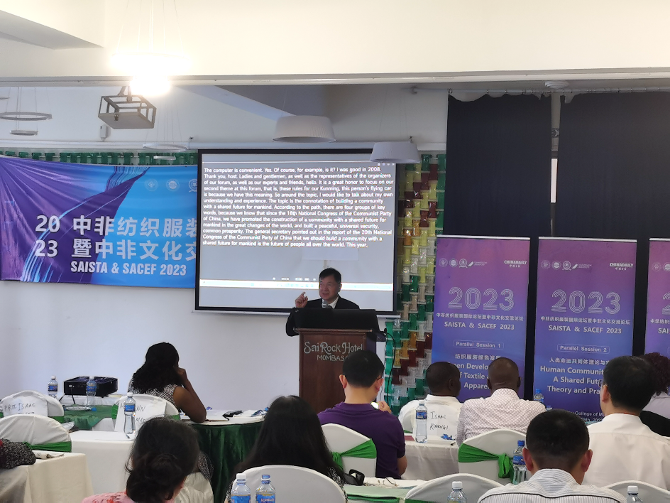 2023中非文化交流论坛暨第四届“人类命运共同体:理论与实践”国际学术研讨会属于第九届中非纺织服装国际论坛暨中非文化交流论坛(以下简称“中非论坛”)平行论坛之一。“中非论坛”由东华大学、肯尼亚莫伊大学、泉州师范大学、德国拜罗伊特大学共同主办,中国日报(China Daily)作为媒体支持。论坛主题为“纺织让生活更美好”(Better Textiles, better life)。论坛设立一个主论坛及三个平行论坛。论坛致辞及演讲嘉宾来自东华大学、天津大学、上海交通大学、安徽大学、中国矿业大学、华东政法大学、泉州师范学院、宁波诺丁汉大学、德国拜罗伊特大学、巴基斯坦国立纺织大学等国内外高校,联合国工业发展组织(UNIDO)、世界自然基金会(WWF)等国际组织和Rivatex东非纺织有限公司等当地企业。天津大学马克思主义学院院长颜晓峰教授应邀出席开幕式,并为论坛作了“人类命运共同体:内涵、根据、路径、态度”的主旨演讲。