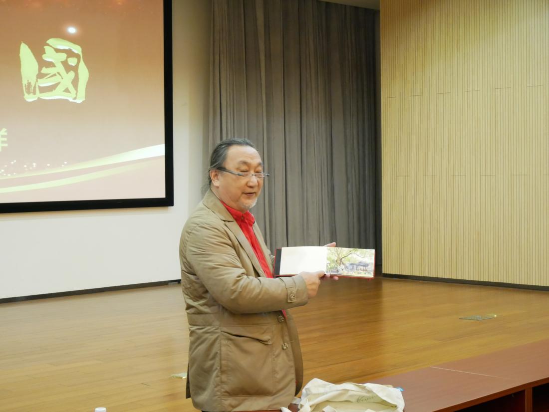 冯信群教授结合自己在长征路、丝绸之路和尼泊尔、土耳其、意大利等国内外地区游历写生时的创作,将一幅幅水彩画背后蕴藏的生动故事娓娓道来。艺术来源于生活,冯老师围绕“艺术融入乡村”话题,生动讲述今年国庆期间在江西创作写生经历,用水彩展现乡间山水风景,将水彩与陶瓷相融合,实现水彩艺术的再创造,分享自己水彩创作的乐趣。