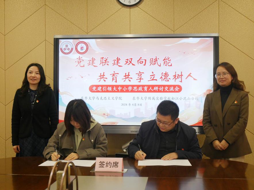 4月8日下午,马克思主义学院师生赴东华大学附属实验学校松江小昆山分校,开展“党建联建双向赋能 共育共享立德树人”党建引领大中小学思政育人共建签约暨就业实践育人基地揭牌仪式。马克思主义学院党委书记戴叶萍、专职党务干部宣蕊、思政课教师张茜、马理硕党支部成员,小昆山分校党支部书记、执行校长杨柳,专职副书记栗锐锋,政教处负责人等参会。本次会议由东华大学发展联络处严晨主持。