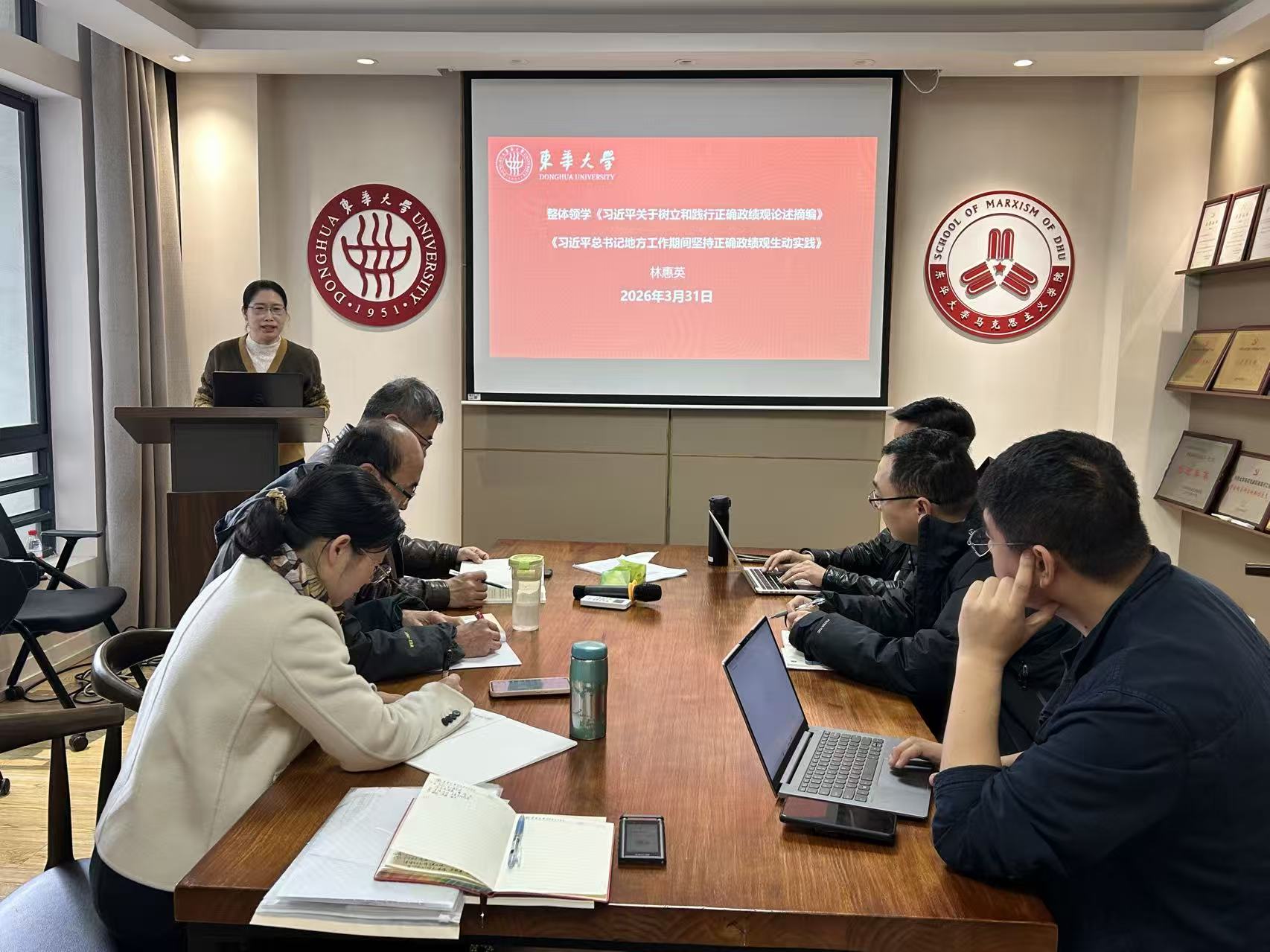 3月31日,马克思主义学院举行树立和践行正确政绩观学习教育领导班子读书班暨党委理论学习中心组学习会。党委书记林惠英主持学习会并作领学报告,学院党政班子成员、工会主席、党支部书记和教研室主任代表共同参加会议。